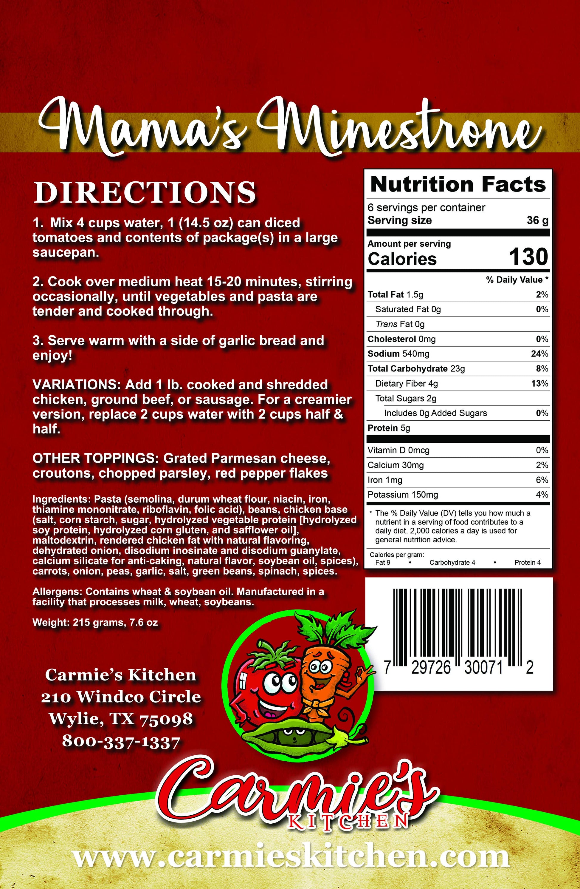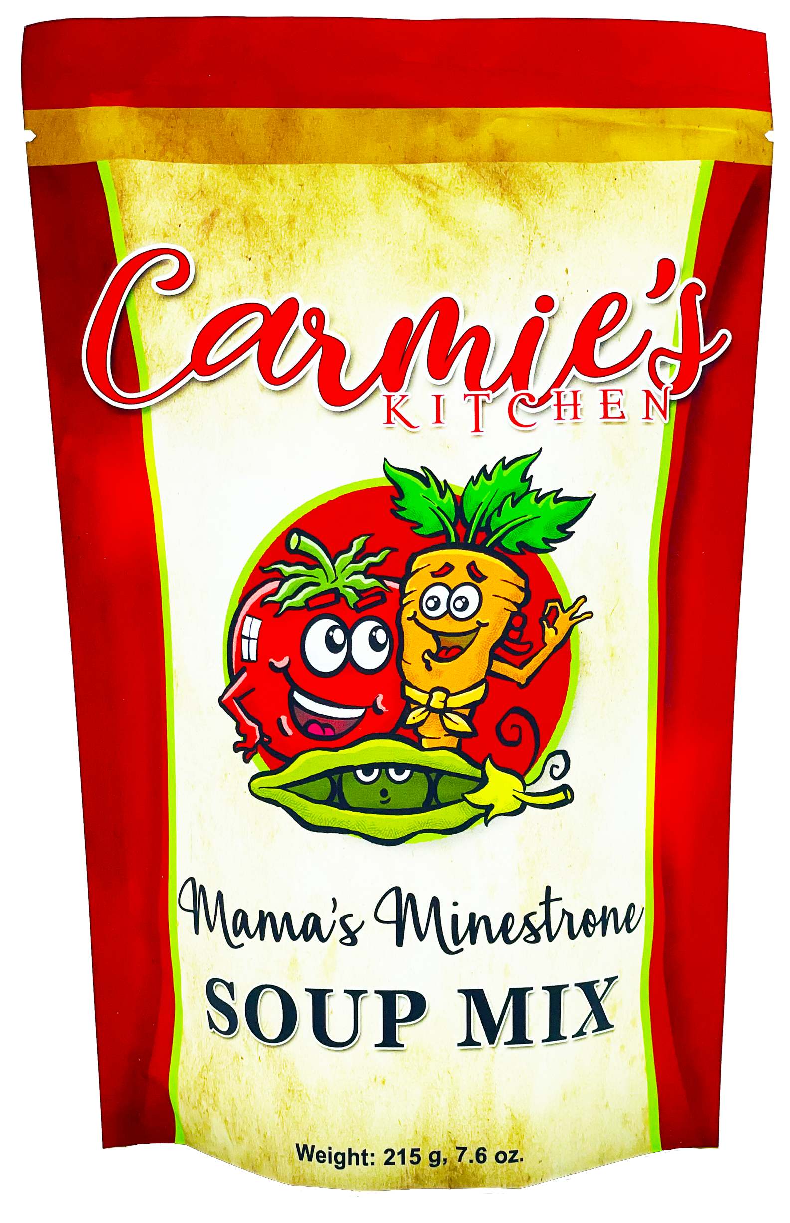Nothing is better than the smell of Mama's soup on the stove! Enjoy our minestrone that is packed full of peas, green beans, carrots, red beans and pasta. Just add tomatoes and water and you have a heart-healthy and delicious soup in minutes. We recommend serving with a side of garlic bread:) For a heartier version, add cooked chicken or beef. Carmie's soup mixes make the perfect stocking stuffer, hostess gift, holiday gift, or holiday party addition!